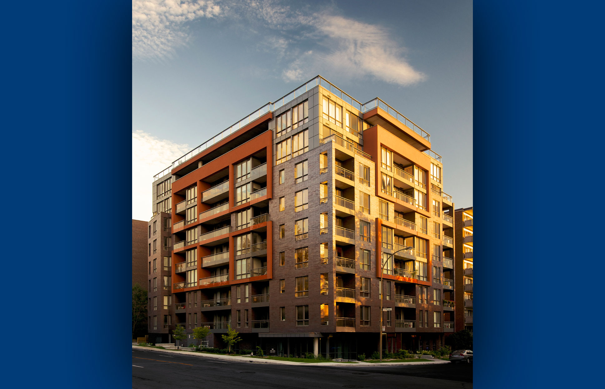 ONYX is a modern designed building including multi-colored exterior cladding in brick, steel panels and glass. In addition, this project contains several 2 storey penthouses, European style appliances, quartz countertops and avant-garde plumbing fixtures.