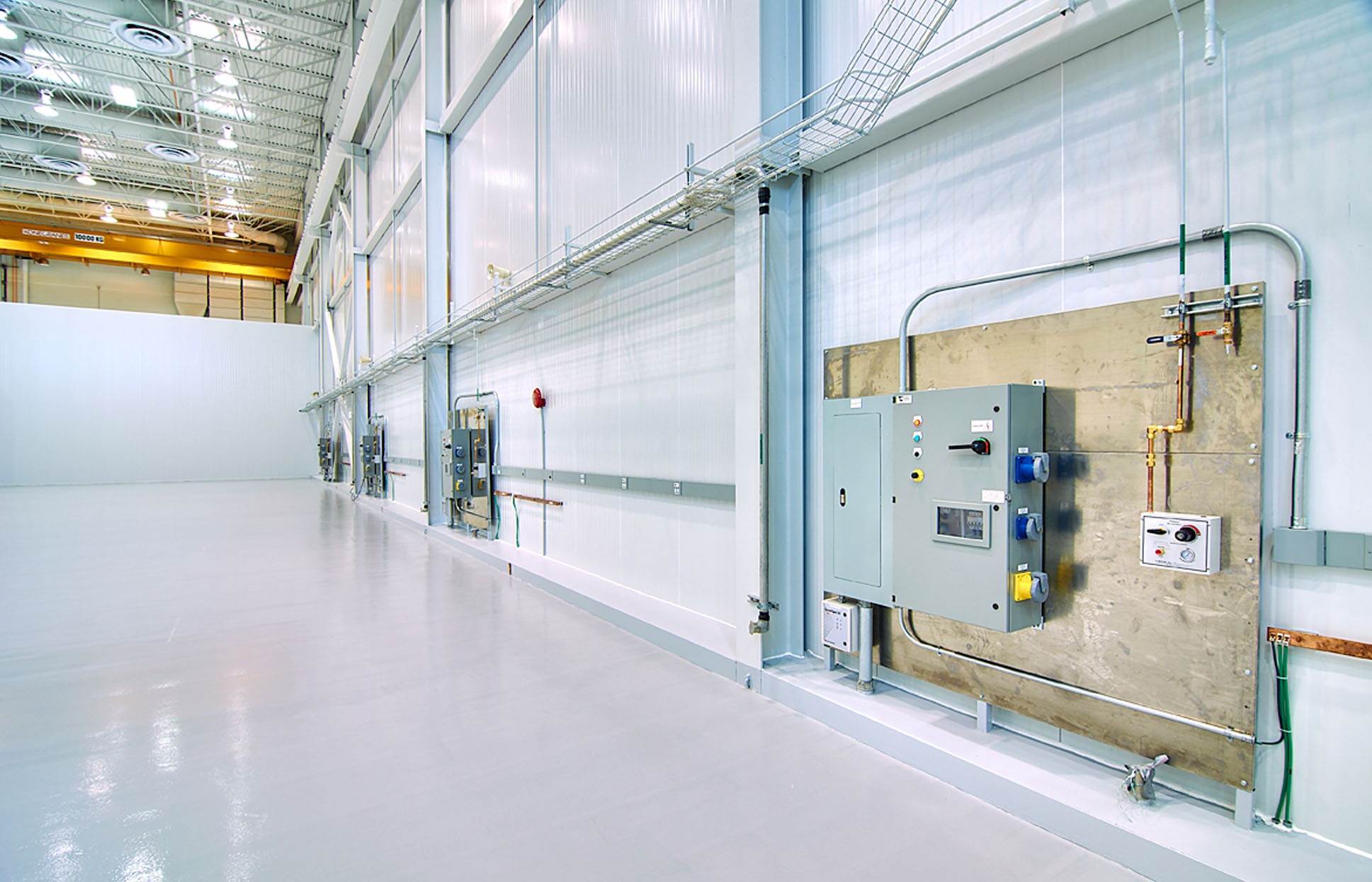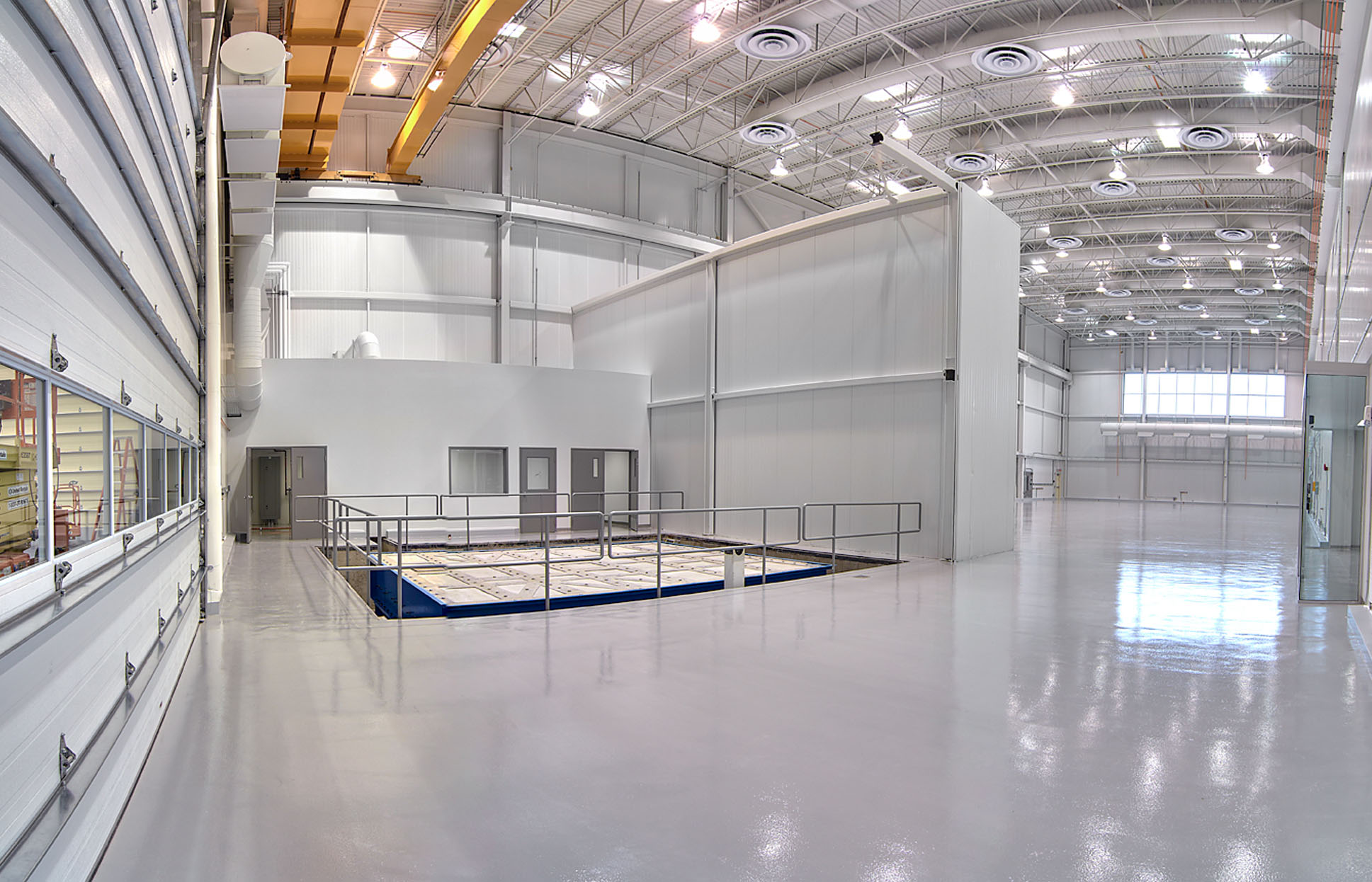 This 44,000 square foot building includes a mezzanine of 13,500 square feet for a satellite manufacturer. Special attributes include a 2,520 sq.ft. clean room that gives access to a larger 45’ clear, 12,250 sq.ft. clean room, classified as a class 100,000 clean room. It is equipped with a pit to receive a 28’-0’’ x 24’-0’’ vibrating table and has two overhead cranes of 10 and 15 tons respectively. It meets all the technical, mechanical and electrical requirements of the International Aerospace Industry.