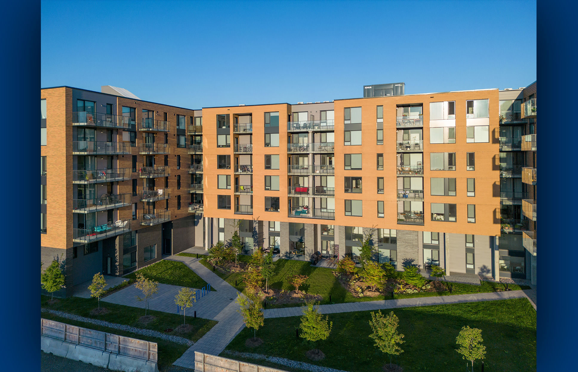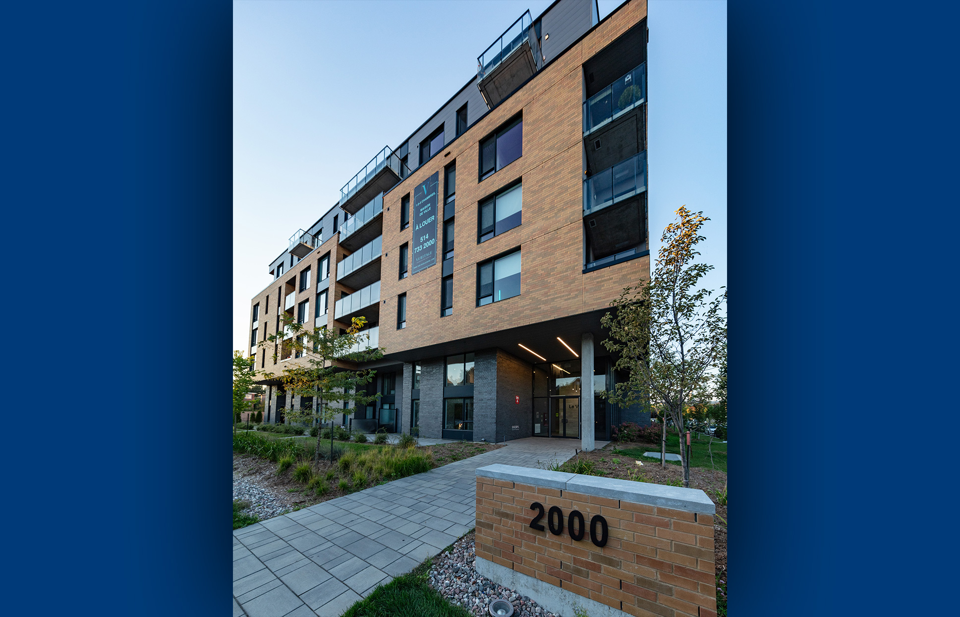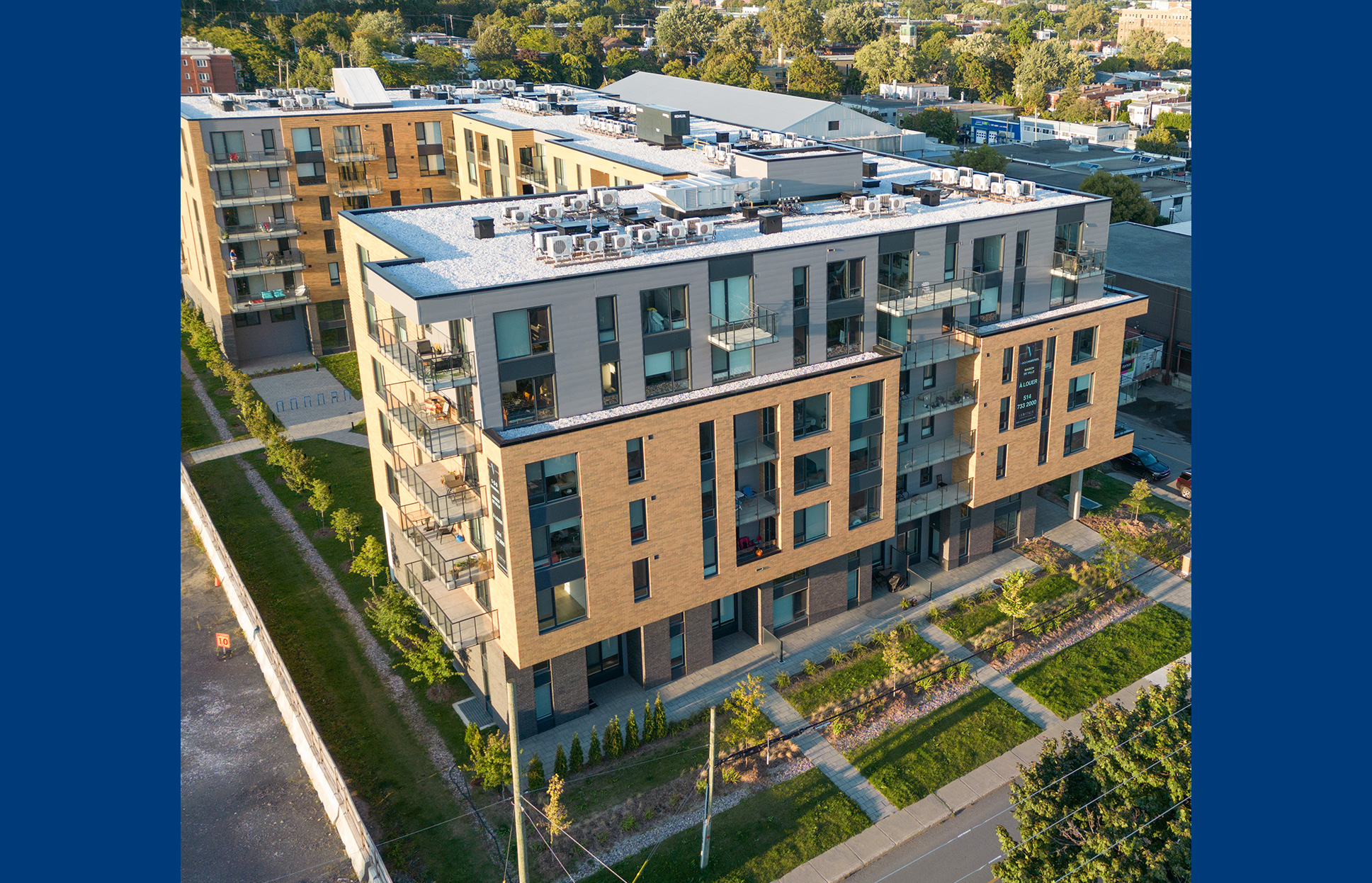 2100 Remembrance, near the heart of the city center of Lachine, includes 139 units with a one floor garage below grade and 7 floors above. Additionally, the project includes fourteen 2-storey townhouses on the ground floor. The overall area of the building is 185,000 square feet.