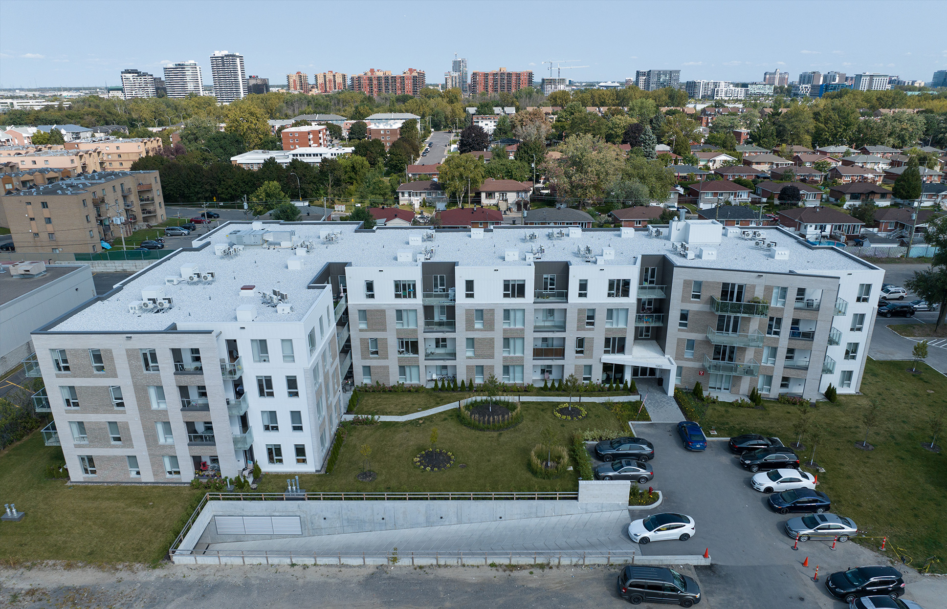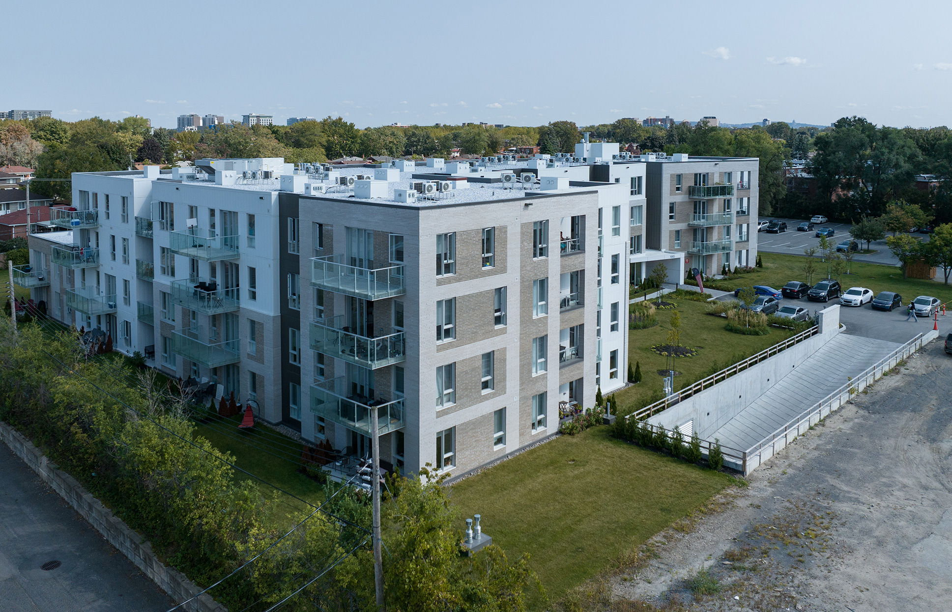 This new project includes the construction of a 4 storey, 78 unit rental building, and 1 storey of underground parking. The building is on a large lot where there is an operating Hampton Inn. The units range from 600 square feet to 1,400 square feet and the construction involves maintaining an existing outdoor pool which sits 5 feet from the new garage foundation wall. The project is 134,260 square feet of gross constructed area.