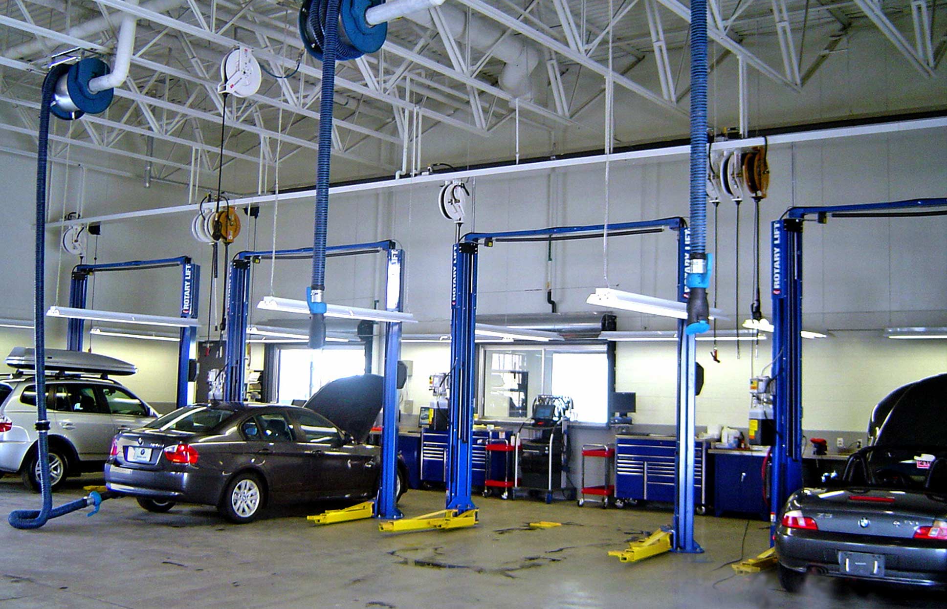 BMW dealership, including full glass curtain wall façade, service and wash bay facilities, and administrative offices